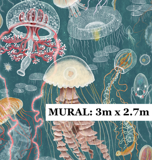 Words from the artist, Katherine Quinn... Drift into the soft elegance of the sea with this light vintage jellyfish pattern. Featuring delicate jellyfish in airy shades of robin's egg blue, faded rose, and soft burnt sienna, this design brings a gentle, nostalgic charm to any space. The lighter tones give a serene, ethereal quality to the jellyfish as they float gracefully through their tranquil seascape.