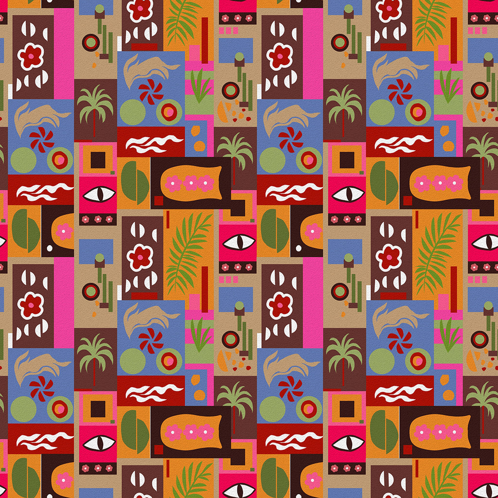Words from the artist, Jen... A bold geometric design capturing the energy of city life while weaving in tropical elements for a sense of escape.