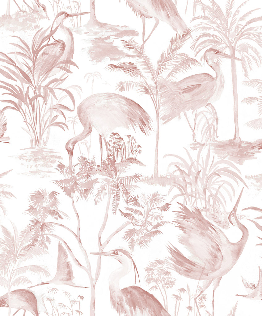 This tropical wallpaper features a soft watercolored design, showcasing heron birds in varying positions amidst a lush backdrop of palm and coconut trees. The fluid, painterly effect adds a serene, natural quality to the vibrant scene.